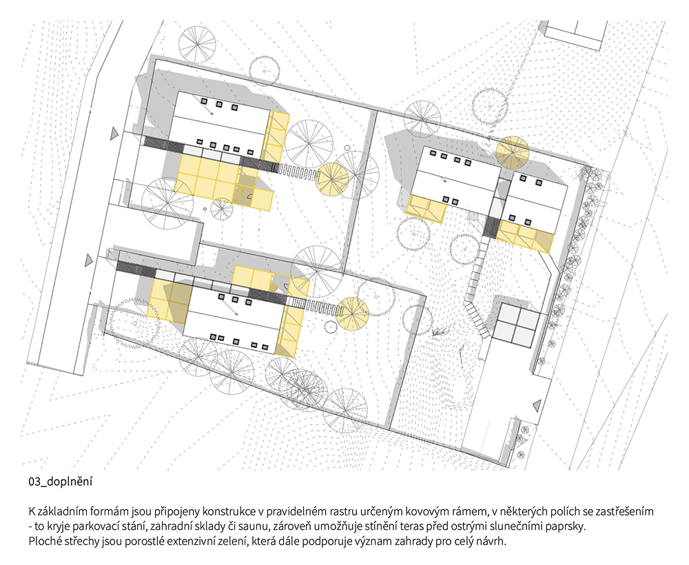 Domy tvoří kompaktní, přesto vzdušný celek s promyšleným urbanismem, který zajišťuje maximální soukromí pro každého obyvatele. V okolí se nachází lesy, cyklostezky, školka, škola i veškerá občanská vybavenost.